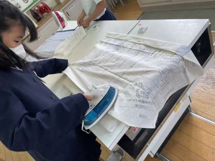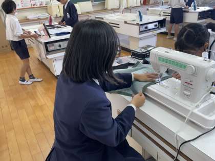 家庭科の授業でエプロンづくりをしています。アイロンや、ミシンを使うときのルールをしっかり守って、友達と声を掛け合いながら活動に取り組んでいます。コントローラーを足で操作し、縫い目がまっすぐになるように意識して丁寧に縫い進めています。