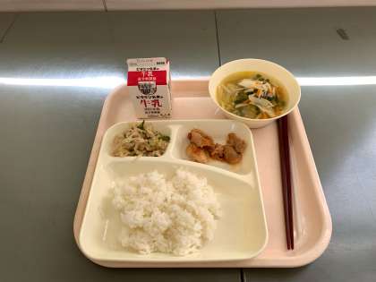 ごはん、牛乳、鶏肉のチリソース焼き、焼き豚とワンタンの皮のスープ(個別対応献立:ワンタンの皮)、切干大根のごま辛みづけでした。