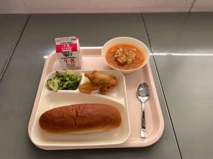 こくとうパン、牛乳、白身魚フリッター、ミネストローネ、ブロッコリーのサラダでした。