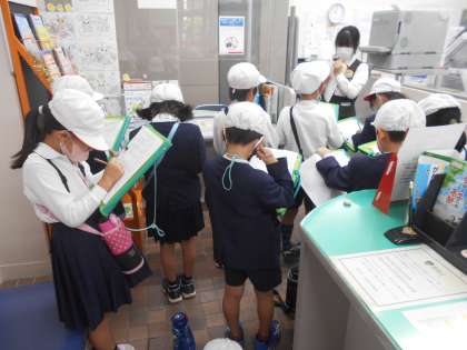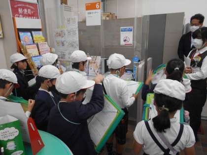 泉尾郵便局に見学に行きました。どのような仕事をしているのか、ポストの数など子どもたちが聞きたいことを質問して答えてもらいました。持って行ったプリントに答えを書いて、後で発表できるようにできました。お礼を言って学校へ帰りました。教室では、見学に行ったみんなでまとめをしました。