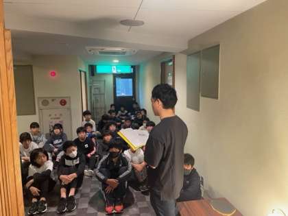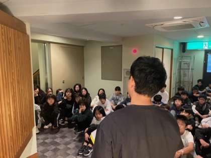 あいにくの雨なので、廊下の隙間を利用しての朝の会です。