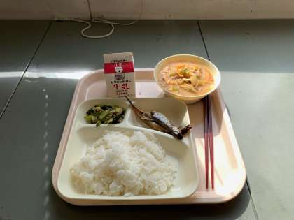 ごはん、牛乳、焼きししゃも、みそ汁、小松菜のいためものでした。