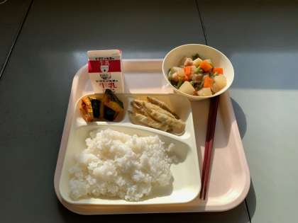 ごはん、牛乳、鶏肉と野菜の煮もの、じゃこ豆、かぶのゆず風味でした。