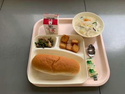 コッペパン、ソフトマーガリン、牛乳、はくさいのクリーム煮、あつあげのピリ辛じょうゆかけ、豚肉とさんどまめのオイスターソース炒めでした。