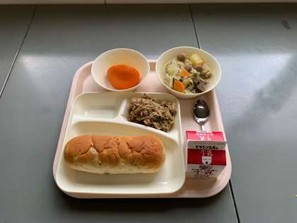 おさつパン、牛乳、ポトフ、ツナと野菜のソテー、いよかんでした。
