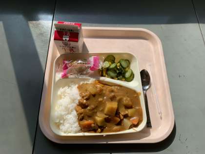 ごはん、牛乳、チキンレバーカレーライス、きゅうりとコーンのサラダ、スイートポテトでした。