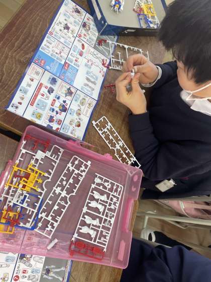 5年生がガンプラアカデミアのプラモデル授業を行いました。製作過程がわかる動画を見て、工場見学の疑似体験を行い、実際にプラモデルの組み立てに挑戦しました。余ったプラスチックの部分は色ごとに集め、リサイクル等の持続可能なものづくりのための取り組みについても学習しました。ものの10分で完成させる児童もいたりと、集中して取り組んでいました。