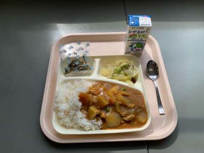 ごはん、牛乳、チキンカレーライス、ビーンズサラダ、ミニフィッシュでした。