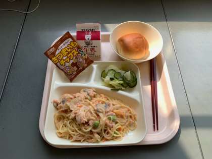 1/2黒糖パン、牛乳、さけのクリームスパゲティ、キャベツときゅうりのサラダ、おさつチップスでした。