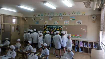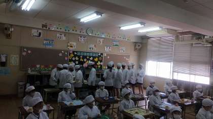 6年生の子どもたちは、1年1組と1年2組の給食のお手伝いをしています。まだ学校生活に慣れていない1年生のために、頑張ってくれています。1年生の皆さんも、6年生にお礼を言っていて、とても良い雰囲気を感じます。