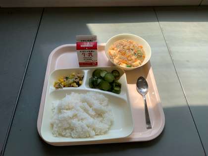 ごはん、牛乳、マーボー豆腐、きゅうりの中華あえ、ツナとチンゲンサイのいためものでした。