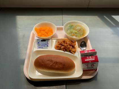 コッペパン、ブルーベリージャム、牛乳、じゃがいものミートグラタン、レタスのスープ、みかん(缶詰)でした。