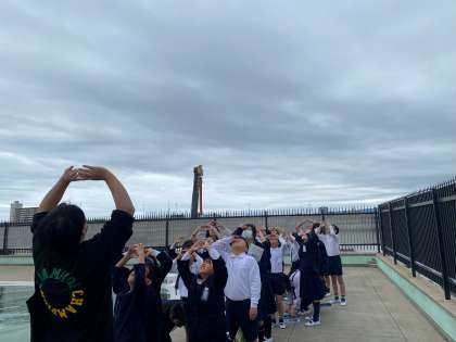 屋上に行き、雲の観察をしました。この日は空一面に雲が広がっていましたが、空の色に違いがあることや、雲が特に多い方角はどちらかなど、よく観察をして気付いたことを書くことができていました。