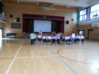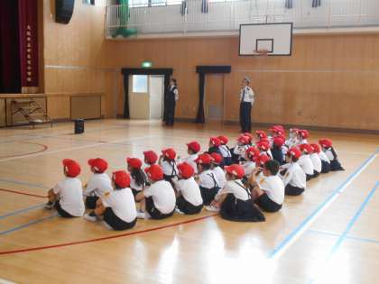 2時間目に、講堂で道路の歩き方や横断歩道の渡り方を大正警察署の方からお話を聞きました。晴れていれば、運動場で実際に歩いて教えてもらえたのですが、小雨が降っていたので体育館でDVDを見ながら教えてもらいました。5月には遠足に行くので今日の話を守って安全に気をつけましょう。また、登下校でも守りましょうね。