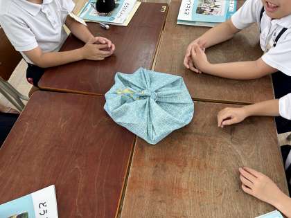 道徳の学習を通じて、実際にふろしきを使って色々なものを包んでみました。ボールや2リットルのペットボトル、教科書、さらにはペットボトル2本、ギフトラッピングにも挑戦してみました。