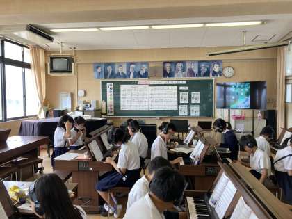 5年生は音楽科で、「こきょうの人々」の曲で「和音や低音のはたらきを感じ取って演奏しよう」の学習をしました。ハ長調の音階や和音をワークシートに書き、和音を覚えました。