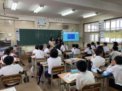 その後、4つのチーム対抗で「ミステリーボックス」ゲームをしました。「What sport do you like?」などの英語の質問に答え、チームでボックスを受け取るか他のチームにパスするかを決めて得点を競い合う楽しいゲームです。子どもたちもボックスの得点に一喜一憂して、大いに盛り上がり、楽しく学習することができました。