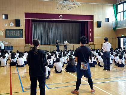 明日から夏休みなので、夏休み前朝会が開かれました。校長先生のお話、3年生と6年生の「7月までの作文」の発表、夏休みの生活についてのお話がありました。