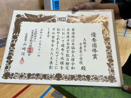 日本漢字能力検定協会から優秀団体賞をいただきました。毎年のみなさんのがんばりが評価されたようでうれしい表彰でした。