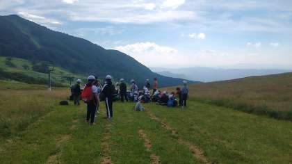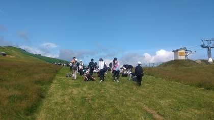林間学習 美しい空と緑。山の中腹で、ひとやすみ、ひとやすみ。