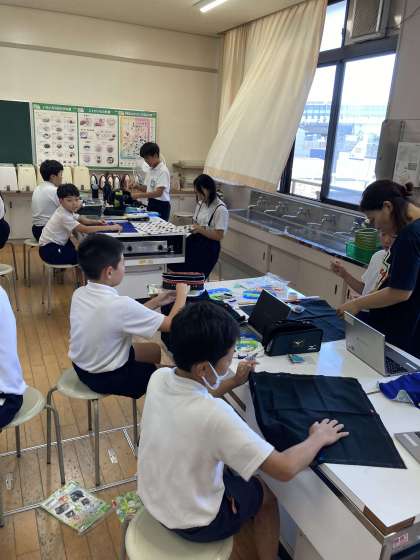 「生活を豊かにソーイング」の単元で、「おべんとうつつみ」を作っています。布に、ていねいに印を付けて、仮縫いをしました。作業の進め方や、玉止め・玉結びなどの仕方については、動画を調べたり友だちと教え合ったりしながら、主体的に進めることができました。