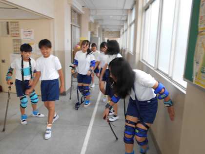 防災教室をしました。6年生は高齢者用装具をつけて、今より体が動きにくいことを体験しました。また、ゴーグルをつけて目が見えにくいことも体験しました。災害の時、高齢者の人と一緒に行動してサポートできるようになってもらえたと思います。このような体験を通じて、困っている人の役に立てるようになってほしいです。