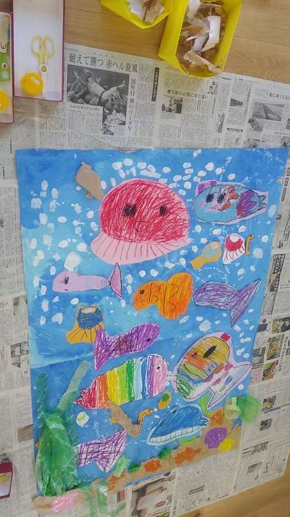 下記の写真にあるように、子どもたちは海の様子を色鮮やかに表現していました。色紙や画用紙で貼り絵をしたり、絵の具で色付けをしたりしながら、仲間と協力して、楽しみながら学んでいました。