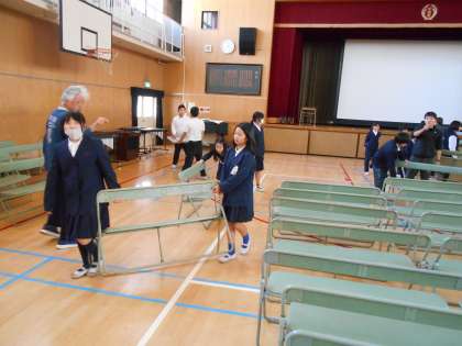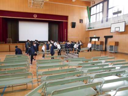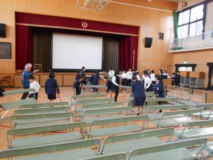 5年生が式典の準備で講堂のいすを出しました。たくさんの数を出して拭いてくれました。