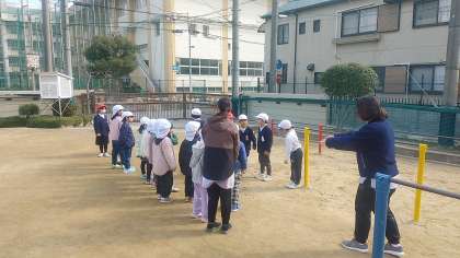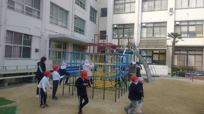 中泉尾小学校の1・2年生の児童が、園児の皆さんをお招きしました。一緒に遊んだり、遊具での遊び方を教えたりしながら交流ました。