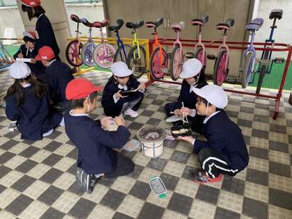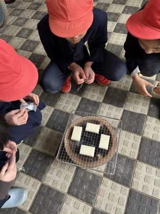 火起こしをしてお餅を焼きました。砂糖醤油やきな粉をつけていただきました。今はボタン一つでガス火が点いたり、IHヒーターで調理が出来る時代ですが、昔は火を起こすだけで大変な作業だったんだなぁと感じることができました。