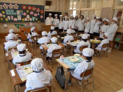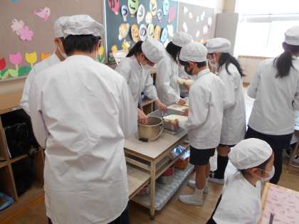 6年生が1年生の給食の用意と片付けをしています。1年生は学校のことを知らないので、6年生がお手伝いをして早く1年生が覚えてもらうようにしています。その様子です。