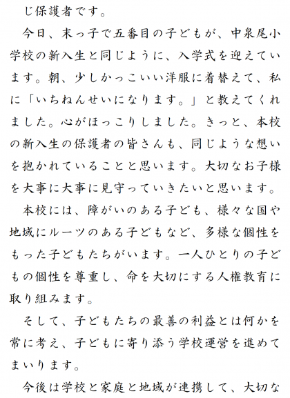 子どもたち、保護者の皆さん、PTAの皆さん、地域の皆さん、教職員が手をつないで、学校運営を進めてまいります。本校の教育活動へのご理解とご協力を賜りますよう、お願いいたします。