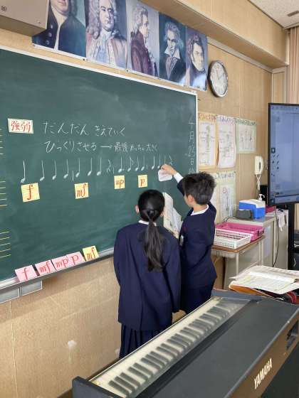 曲の終わり方をグーループで考え、ハンドクラップに挑戦しました。「みんなをびっくりさせるようにしたい」や「だんだん消えていくような感じがいい」などと話し合った後、リズムのどの部分にどんな強弱記号をつければいいかを工夫しました。工夫が伝わるように発表できた時は、みんなから拍手をもらって、とても嬉しそうでした。変哲もない手拍子のリズムが、素敵な音楽に変わり、みんなの笑顔が生まれる楽しい時間を過ごすことができました。まさに曲名の通り「クラップフレンズ」ですね。