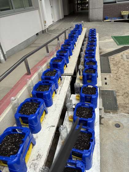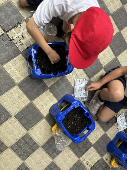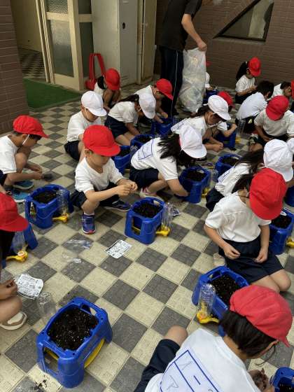 朝顔の種の形を観察した後、種をまきました。これから、大きく育つように毎日お水をあげてお世話をしたいと思います。