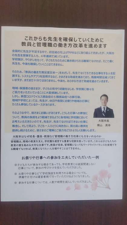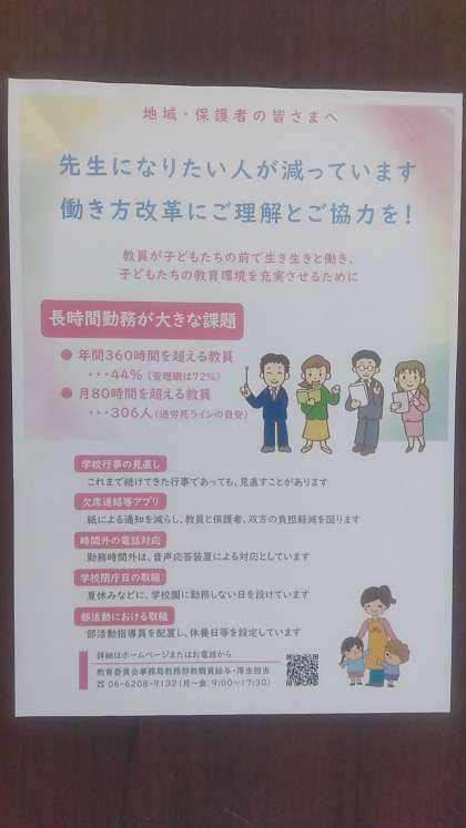 また、先生が、先生でなければできない仕事に専念し、そして何より、子ども一人ひとりに向き合い、質の高い教育を提供し続けるために、地域と保護者の皆様のご理解とご協力をどうかよろしくお願いします。