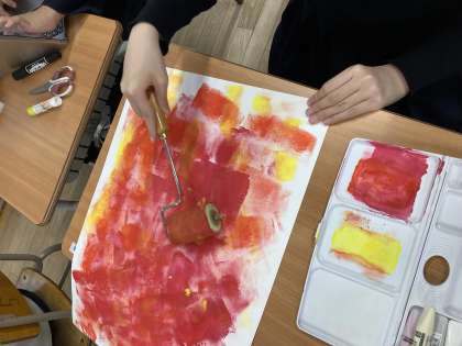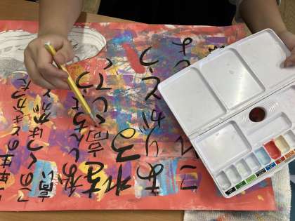 自分のくつを鉛筆でデッサンしました。細かいところまでよく見て、線の入れ方を工夫し立体感を出しました。次に、画用紙に絵の具で好きな色を筆やローラーで塗り、切り取ったくつを貼り付けます。最後に自分のくつへの思いを表す詩を書いて出来上がりです。一人一人が自分のくつに愛着をもって表現することができ、味のある素敵な作品ができました。