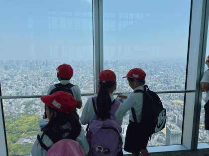 当日はお天気にも恵まれ、展望台からは大阪の町を一望することができました。子どもたちは、「あれが○○だ!」「こんな建物があったんだね!」と景色に興味津々でした。事前学習で調べた建物を一生懸命探しながら、ワークシートの課題に真剣に取り組んでいました。 これからも、身のまわりの地域に目を向け、社会科の学びを深めてほしいと思います。