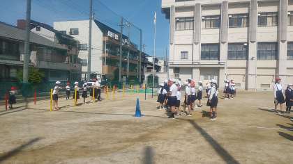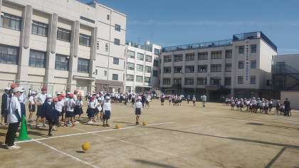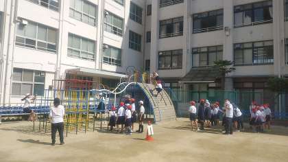 中泉尾小学校では、たてわり班に分かれて、ボール蹴りをしたり、鉄棒にぶら下がったり、コンビネーション遊具で遊んだりしています。異学年の子どもたちが、「がんばれー」と声を掛け合って、楽しく取り組んでいます。