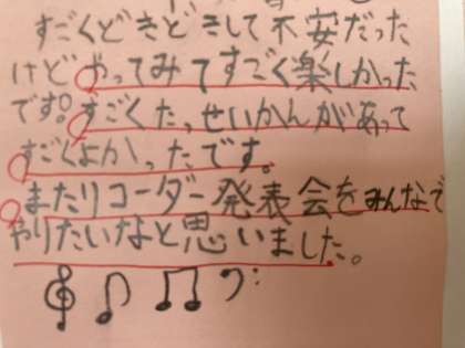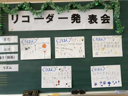 「失敗せずにすらすらふけてよかった。」「力を合わせたら、とてもいいリコーダーになった」「すごくどきどきして不安だったけど、やってみてすごく楽しかった」などの感想が聞かれ、達成感を味わうことができました。また、友だちの発表の良いところをたくさん伝え合うことができ、大きな拍手が沸き起こりました。