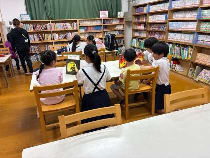 北恩加島保育所の子どもたちと図書室で交流をしました。どんな本を読みたいのかを聞いたり、絵本の読み聞かせをしたりと優しい中泉尾の子どもたちでした。