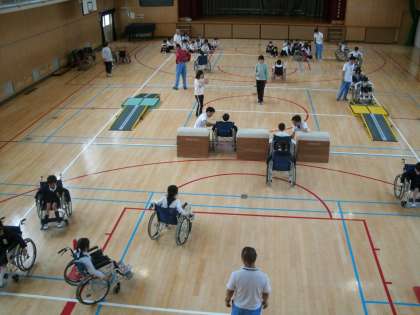 5月10日(火)3時間目に大阪市職業リハビリテーションセンターの方々から、車イスの構造や安全な使い方の説明を受けた後、講堂に作られた、段差や坂道、狭い通路などのコースを車イスに乗って回る体験をしました。