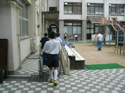 4時間目には、実際に校舎の通路やスロープ、運動場などを使って3人一組になり、「車イスに乗る人」「車イスを押す人」「進路の安全確認をする人」を交代で体験しました。