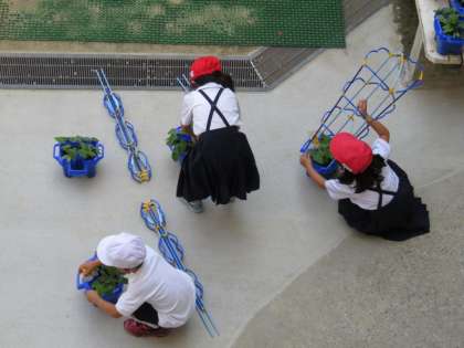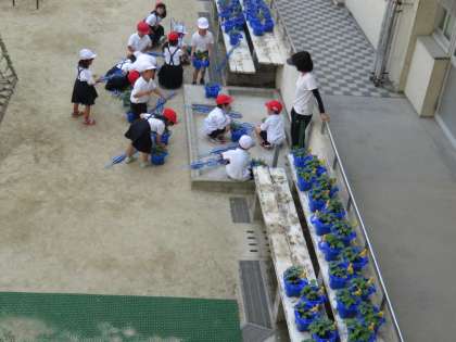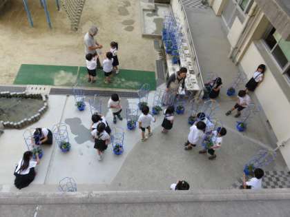 双葉だった朝顔の苗に、本葉が2〜3枚出てきました。これから「つる」が巻きつくことができるようにと自分の鉢に支柱を立てました。そして、これからどんどん大きくなっていくために必要な「肥料」も土に蒔きました。1年生は毎日水やりをしながら朝顔の成長を見守っています。
