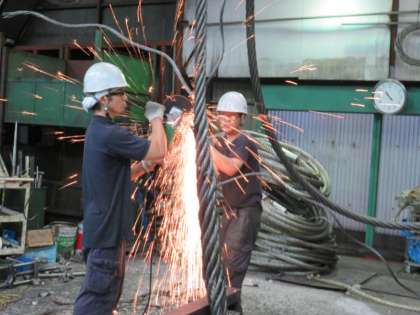 はみ出したワイヤーを切るときは火花が飛びます。相手に火花が当たらないよう角度を上手に調節しています。