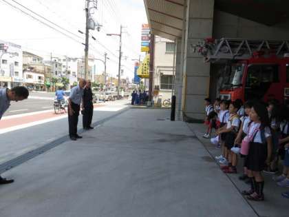 水槽付きポンプ車、化学消防ポンプ車、はしご車などたくさんの消防車を見た後、救急車の中も一人一人見せていただきました。