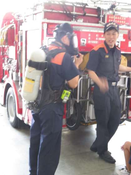 燃える火の中へ人を助けにいく時は、空気の入ったボンベとマスクをします。女性の消防士さんはかっこよかったです。