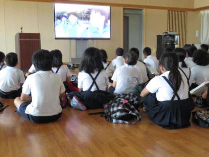 東日本大震災の時、中学生が防災教育を生かして高い所へ高い所へと逃げて、周りの小学生をも救った「釜石の軌跡」をアニメにしたDVDを見て津波からの身の守り方を学習しました。