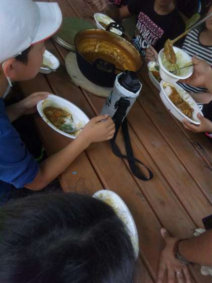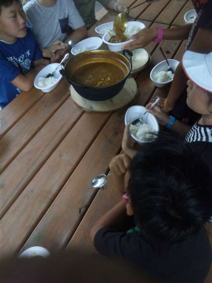 自分たちで作って食べるカレー、どの班も自分の班が「一番美味しくできている」と自信満々です。