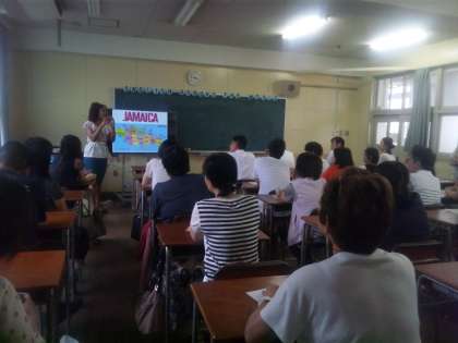 英語Aでは、5、6年生の英語指導に来ていただいている、ジャマイカ出身のカレン先生からジャマイカという国の紹介や自己紹介がなされました。分かりやすい英語を使っていただきましたが、通訳がないと困ることもありました。