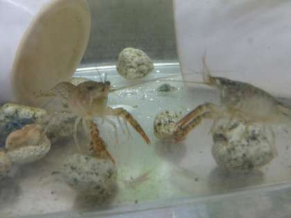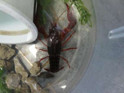 親のザリガニは、濃い赤の堅い殻に覆われていますが、生まれたばかりの赤ちゃんは透明でエビのようです。だんだんと成長するにつれ体が黒っぽくなりハサミの先から赤っぽくなってきています。やっとザリガニだなと思えるようになりました。